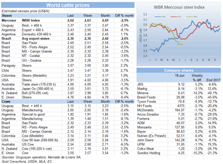 巴西市場育肥牛價格比較混亂,所有屠宰場都想壓價,但是活牛供應(yīng)減少使某些州牛價反而開始上漲。跟往常一樣,本季活牛供應(yīng)開始降低,同時國內(nèi)市場牛肉庫存也在減少,但消費市場也沒有什么需求,所以牛價近期上漲比較困難,圣保羅州牛價保持在140雷亞爾,與上周持平,已經(jīng)連續(xù)五周價格保持穩(wěn)定,但其他一些州牛價微漲。前文提到的對JBS腐敗調(diào)查可能會影響市場走勢,增加不確定因素。