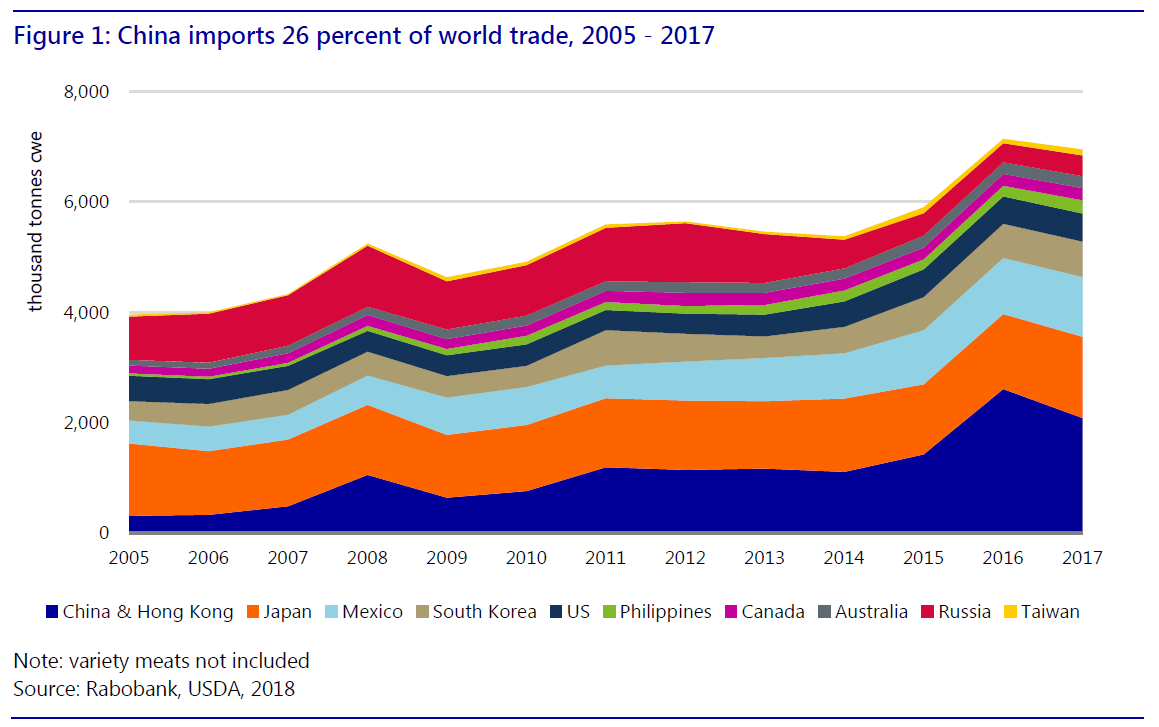l 中國已成為豬肉和副產(chǎn)品出口最大對象國。其他亞洲國家的豬肉進(jìn)口需求也在增長。豬肉進(jìn)口產(chǎn)品除了低貨值種類還包括增值產(chǎn)品。