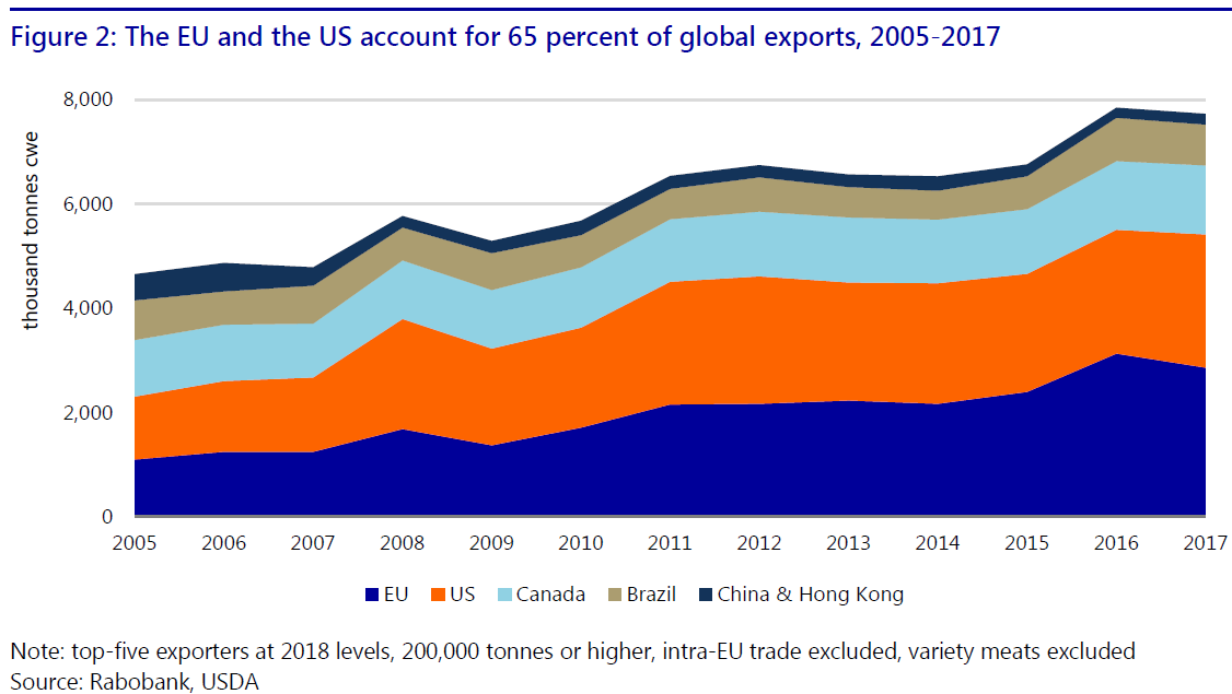2017年全球豬肉交易830萬噸,180億歐元,交易量占17年全球產(chǎn)量的7.5%。歐盟、美國、加拿大和巴西四大豬肉出口國出口數(shù)量占全球豬肉出口的91%。自2010年,國際豬肉交易增長超過37%,雖然中國進(jìn)口需求下降導(dǎo)致17年國際豬肉交易量略有下降。