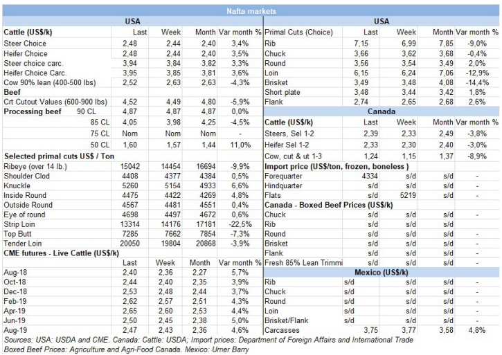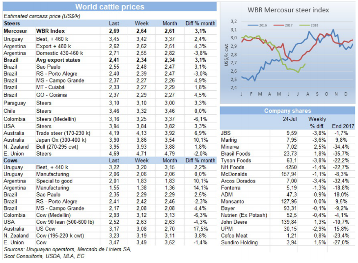 本周各國貨幣尤其是巴西雷亞爾增值,使閹牛價(jià)格上漲,南方共同市場(chǎng)閹牛指數(shù)上漲5美分到2.69美金。巴西雷亞爾對(duì)美金增值2.5%,部分原因是總統(tǒng)候選人Geraldo Alckmin受歡迎度很高,10月大選前景比較被看好,而且本地牛價(jià)也增加了0.3雷亞爾/公斤,綜合起來育肥牛價(jià)格漲了7美分到2.41美金,9周以來最高。烏拉圭閹牛價(jià)格由于供應(yīng)緊缺也漲了,阿根廷牛價(jià)穩(wěn)定,貨幣也穩(wěn)定,連續(xù)四周價(jià)格不變,巴拉圭由于處于口蹄疫接種時(shí)期,市場(chǎng)比較平靜,牛價(jià)保持不變。
