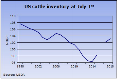 7月日美國所有的活牛和小牛存欄1.03億頭,比去年同期高1%,數(shù)據(jù)預(yù)示牧場(chǎng)數(shù)量增加接近尾聲,但活??偭课磥韼啄赀€會(huì)緩慢攀升,近幾年牛肉產(chǎn)量還是會(huì)持續(xù)增加,對(duì)育肥牛和存欄牛價(jià)格施壓。母牛和小母??偣?span>4190萬頭,比去年同期高1%,肉母牛3250萬頭,奶母牛940萬頭。小牛犢3650萬頭,同比增加2%,上半年出生2660萬頭小牛,同比增加2%,下半年預(yù)計(jì)還會(huì)出生990萬頭小牛。