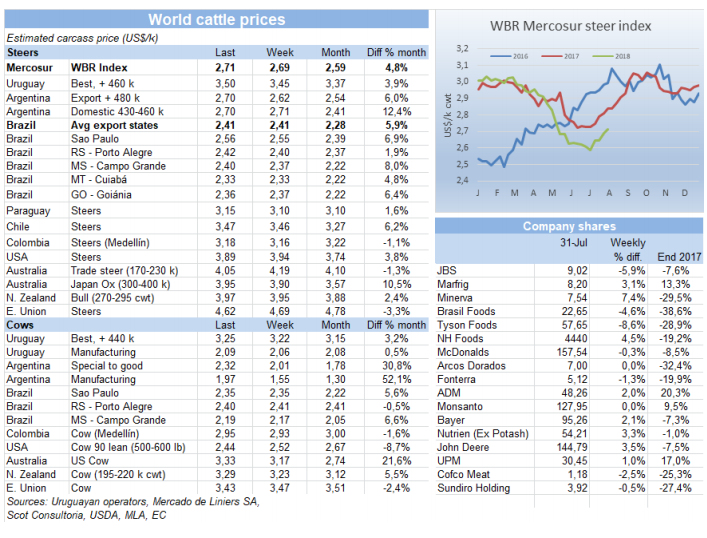南方共同市場閹牛指數(shù)本周漲了2美分到2.71美金,12周以來最高,本周阿根廷,烏拉圭和巴拉圭牛價都上漲,巴西保持不變。阿根廷近期牛價又開始強勁上漲,本周漲了2比索,換算成美金價漲了8美分至2.7美金,比6月中最低的2.43美金高了很多,巴拉圭和烏拉圭供應短缺也促使牛價上漲。巴西本地牛價微漲,但被貨幣的小幅貶值抵消了。