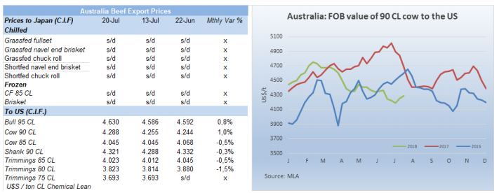 中國市場沒有活躍的跡象,不確定這一過程會持續(xù)多久,中國進口商想還跟匯率上漲之前一樣的人民幣價格,把匯率上漲的成本轉嫁給出口商,因此還價折換成美金非常低,很難成交。比如全牛前報盤3100,還盤2900,90機測牛前報3900,還3550。美金人民幣匯率從展會時的6.3漲到現(xiàn)在的6.9,意味著成本上升了15%,八月對今年的市場發(fā)展趨勢非常關鍵。此外水漂貨走量和價格也很疲軟,巴西腱子甚至不超過3600。
