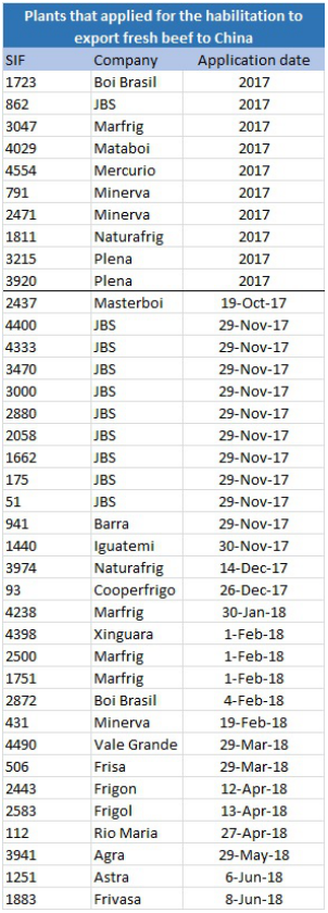 巴西十月前三周出口了9.5萬(wàn)噸牛肉,均價(jià)3938美金/噸,保持這個(gè)頻率的話,十月總共會(huì)發(fā)運(yùn)14.5萬(wàn)噸,接近九月份創(chuàng)下的15萬(wàn)噸的記錄。前九個(gè)月出口64.4萬(wàn)頭活牛,同比增加60.8%。目前38家巴西牛肉工廠申請(qǐng)中國(guó)證,其中10家會(huì)被優(yōu)先開放,另外28家需等待第二批。由于中美貿(mào)易戰(zhàn),中國(guó)政府希望開放其他貨源來(lái)彌補(bǔ)美國(guó)貨源的損失,所以開放廠家的速度可能會(huì)加快。以下是申請(qǐng)中國(guó)證的廠家名單,前十家會(huì)優(yōu)先開放: