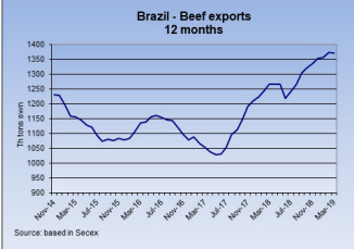巴西三月份出口牛肉均價3721美金/噸,自2016年三月以來最低,另外出口量也比去年低,三月份共出口118523噸牛肉,比二月份多3000噸,但同比減少3000噸,其中一個原因是今年狂歡節(jié)是三月,而去年是二月。第一季度巴西共出口33.6萬噸牛肉,均價3740,出口量增加5.4%,而均價跌了8.2%。