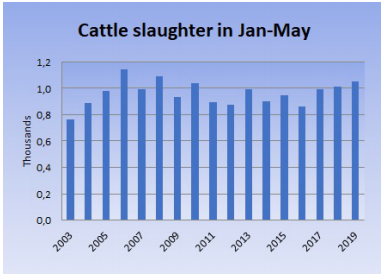 跟去年同期類似,雖然牛只存欄結(jié)構(gòu)預(yù)示屠宰量會下降,但實際情況正相反,需求量過大,價格很有吸引力,刺激農(nóng)牧場出欄,本周牛只屠宰量比前一周減少了2000頭,但同比還是增加3000頭,第一季度屠宰量同比減少3.5萬頭,但四五月屠宰量同比上升,截止到本周末今年共屠宰了近100萬頭,比2018年同期高了差不多2萬頭,五月屠宰量預(yù)計在22萬頭上下,遠高于去年五月的18.1萬頭。和2018年一樣,雖然育肥閹牛存欄量較低,但預(yù)期的屠宰量大幅減少這一情況并沒有發(fā)生,截止到5月25日這周共屠宰49291頭牛,其中閹牛是主要品類,達到25236頭,因為屠宰場在為7月1日開始的新481配額做屠宰。