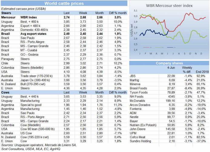 南方共同市場(chǎng)閹牛價(jià)格上漲6美分到2.74美金/公斤,三月中以來(lái)最高,主要驅(qū)動(dòng)力來(lái)自巴西雷亞爾,雖然對(duì)經(jīng)濟(jì)增長(zhǎng)減速有所擔(dān)憂,本周還是增值3.5%,主要出口州牛價(jià)只上漲了0.3雷亞爾/15公斤,到141雷亞爾,但換算成美金牛價(jià)上漲了9美分到2.49美金。烏拉圭活牛市場(chǎng)還是過(guò)熱,閹牛價(jià)格本周再度上漲12美分,比其他國(guó)家都高了1美元/公斤以上。阿根廷和巴拉圭牛價(jià)沒(méi)有變化。