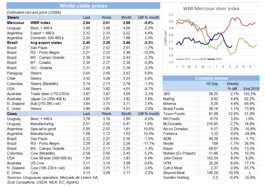 近期中美貿(mào)易戰(zhàn)推動了南方市場平均閹牛價格從上周的低價中復蘇。中美兩國同意十月上旬在華盛頓繼續(xù)協(xié)商,導致市場平靜,區(qū)域貨幣利好。巴西雷亞爾本周增值1.6%,上半月的額外需求使得育肥閹牛價格堅挺。巴西主要出口州育肥閹牛均價增長了5美分,增長到2.4美元/公斤。阿根廷市場更加平靜,匯率的穩(wěn)定導致了出口閹牛胴體比索價格輕微下跌。美元價格下跌1美分跌至2.32美元/公斤。巴拉圭和烏拉圭穩(wěn)定的價格持續(xù)了幾周,巴拉圭胴體價格2.65美元/公斤,烏拉圭胴體價格4美元/公斤。世界牛肉周報南方市場閹牛價格指數(shù)增長3美分,增長至2.64美元/公斤。