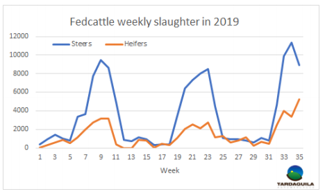8月屠宰從飼育場出欄的閹牛約3.5萬頭,幼母牛1.5萬。本月的最后三個星期,育肥閹牛的占比攀升至45%以上,而幼母牛在本月的最后一周達到了62%。八月份共屠宰閹牛8.1萬只,其中從飼育場出欄的占43%。幼母牛屠宰量占比升至49%。八月的最后三周和九月的第一周,加工廠在為10月1日開始的下一個季度的歐洲481配額準備谷飼牛只。
