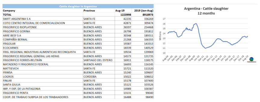 八月牛屠宰總量達122,3998頭,比去年略低,去年八月總屠宰量126,7176頭,創(chuàng)2009年清理存欄之后月屠宰總量最高紀錄。加上八月的數(shù)字,今年的前2/3屠宰總量增至891,8973頭。屠宰量按公司排名,Swift繼續(xù)領先,1-8月屠宰33,6269頭牛,其次是Coto超市連鎖店,30,9474頭,Rioplatense(25,4468頭),Gorina(19,1812頭)和ArreBeef(18,9311頭)。