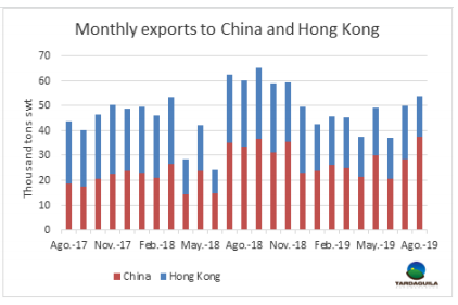 八月巴西對(duì)中國(guó)港口直接牛肉出口量達(dá)3,7292噸,創(chuàng)新紀(jì)錄。銷往香港牛肉量減少至1,6576噸,兩者總計(jì)5.4萬(wàn)噸,是自2018年11月以來的最大。出口埃及1,8590噸,超過中國(guó)香港,本年度截至八月,累計(jì)出口至北非國(guó)家11.1萬(wàn)噸,比去年同期增長(zhǎng)12%。巴西對(duì)其他國(guó)家年度出口總量中的第四位是阿拉伯聯(lián)合酋長(zhǎng)國(guó),與2018年的5.1萬(wàn)噸相比,其購(gòu)買量增加了五倍以上。