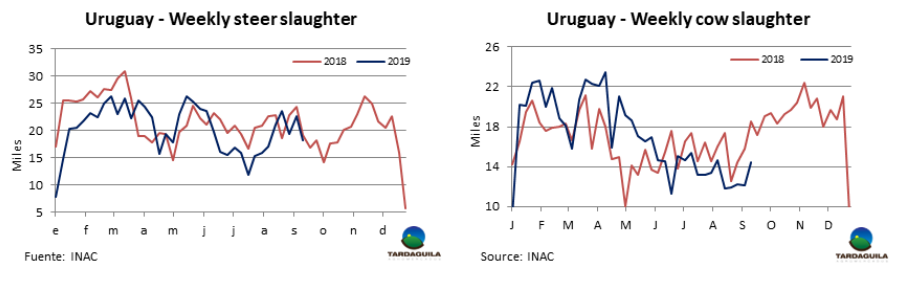 隨著481配額的最后一批貨將在10月1日到港,牛只屠宰量尤其是閹牛屠宰量下降。37周合格工廠共屠宰1440254頭牛,比上周減少42393頭,減少了5%,比去年同期減少6000多頭,本周閹牛屠宰量減少約4300頭,減少了19%,減少至18278頭,母牛屠宰量增長(zhǎng)2300頭,增長(zhǎng)至14463頭。屠宰量最大的廠是 Las Piedras (4,483頭), Marfrig-Tacuarembó (4,126頭) and Minerva-Canelones (4,047頭)。Marfrig三家工廠共屠宰9938頭,Minerva兩廠共屠宰6248頭。