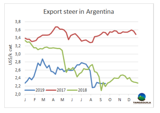 今年,巴西冷鮮牛肉出口歐盟平均價(jià)格猛烈下跌。本年度截至八月均價(jià)7298美元/噸,比2018年同期減少17%,八月降價(jià)趨勢(shì)仍然持續(xù),均價(jià)6640美元/噸。冷凍牛肉情況一樣,年平均價(jià)格下跌12%,降至5451美元/噸。