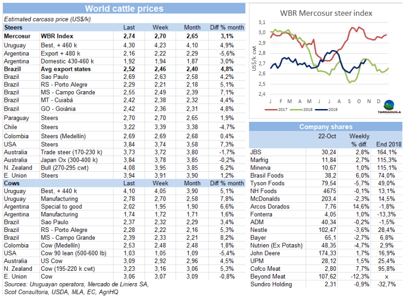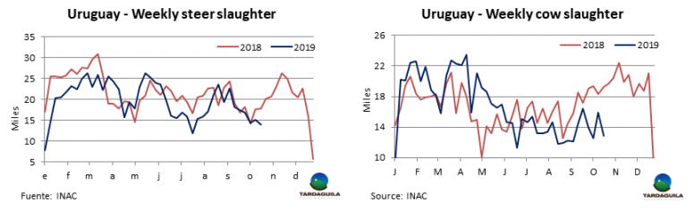 上周牛屠宰量減少是由于草飼牛只短缺和降水引起的裝運(yùn)困難。烏拉圭肉協(xié)報(bào)道,10月19日,被批準(zhǔn)的加工廠牛只屠宰量總計(jì)33398頭,比上周減少3379頭,減少了9.2%,比去年同期減少10000頭。在周對(duì)比中,母牛屠宰量減少3000頭,減少至12906頭。閹牛屠宰量減少1100頭,幼母牛屠宰量增加818頭,增加至5724頭。屠宰量最大的廠是 Minerv-PUL(3779頭),Las Piedras(3114頭),Marfrig-Colonia(2984頭)。Marfrig四家工廠自前一周起共屠宰10478頭牛,Minerva僅PUL一家廠進(jìn)行屠宰活動(dòng)。10月截至目前,牛只屠宰量96137頭,比去年同期減少22.8%,考慮到上周因降水造成的延誤,本周屠宰量將有增長(zhǎng)。但無(wú)論如何10月屠宰量與2018年的20.1萬(wàn)頭相比將減少3.6-3.8萬(wàn)頭。這將是2013年以來(lái)10月份的最低水平。