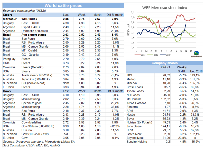 南方市場閹牛平均價格從2018年4月起達(dá)到最高水平。世界牛肉周報南方閹牛胴體價格增長了11美分,增長至2.85美元/公斤。上漲有多方面原因。最為顯著的是阿根廷價格的上漲,周日反對黨在大選中勝出時,報盤數(shù)量立刻達(dá)到最低,官方對貨幣兌換進(jìn)行了嚴(yán)格控制。阿根廷出口閹牛價格增長了33美分,增長至2.49美元/公斤,包含進(jìn)口稅。巴西育成公牛增長也很強勢,雷亞爾價格漲了2.1%,每15公斤牛肉價格增長了3雷亞爾。因此在巴西主要的出口州育成公牛平均價格本周增長11美分,增長至2.62美元/公斤。烏拉圭和巴拉圭的市場參考價本周保持不變,烏拉圭價格4.3美元/公斤,巴拉圭2.7美元/公斤。