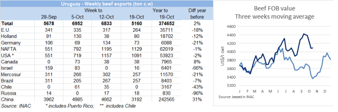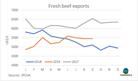 9月冷鮮、冷凍和加工類牛肉出口達(dá)54729噸,價值約2.98億美元。這些數(shù)字表明了出口量同比增長61.6%,收益增長了72.4%,這兩種計量方式的差異是因為出口價格的上漲,年度增長6.7%,出口價格上漲在冷鮮去骨產(chǎn)品和冷凍去骨產(chǎn)品中表現(xiàn)并不均衡。9月去骨冷鮮產(chǎn)品報價8700美元/噸,比2018年9月上漲1.5%,冷凍去骨產(chǎn)品達(dá)5000美元/噸離岸價,比去年增長22.5%。