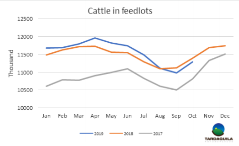 10月美國農(nóng)業(yè)局牛只存欄報告沒有巨大變化,10月1日飼育場存欄1130萬頭,比一年前下降1.1%,這是年度對比中第二個存欄總數(shù)連續(xù)減少月。9月補欄總計209萬頭,比2018年高2%,9月賣到市場的牛只共174萬頭,比2018年增長1%。2019年比去年多一天交易日。8月12個月平均存欄1160萬頭,存欄量比上兩個月有輕微下降。
