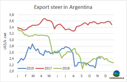 大選結(jié)果確定和貨幣兌換管控過(guò)后出口價(jià)格仍然堅(jiān)挺。英國(guó)純種閹牛報(bào)價(jià)140-145比索/公斤,印度串種閹牛報(bào)價(jià)136-140比索/公斤,母牛價(jià)格上漲趨勢(shì)受中國(guó)需求影響,仍保持上漲趨勢(shì):特種和良種母牛報(bào)價(jià)140-145比索/公斤,工業(yè)母牛報(bào)價(jià)125-130比索/公斤。