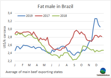 本周在巴西主要的活牛交易市場育成牛價(jià)格再次出現(xiàn)下行,近幾日有穩(wěn)定跡象,有些地區(qū)甚至出現(xiàn)上行修正。牛只供應(yīng)有限,需求也是一樣,預(yù)計(jì)接下來幾天會(huì)繼續(xù)縮減,因?yàn)橐恍┕S在今年年末和2020年年初停止屠宰活動(dòng)。圣保羅期貨市場第一批期貨(12月到2月)價(jià)格上漲,尤其是12月的合同價(jià)格上漲了6.6雷亞爾/15公斤,2020年年中以后仍然呈下行趨勢。批發(fā)市場牛肉價(jià)格繼續(xù)下跌。