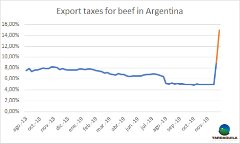 上任一周以來,宣布一系列聲明后,基什內(nèi)爾政府阿爾貝托·費(fèi)爾南德斯希望國會(huì)今天批準(zhǔn)《經(jīng)濟(jì)緊急狀態(tài)法》草案,該草案于昨日在議會(huì)上提交,將賦予他非凡的權(quán)力,在許多微妙的問題上避免立法的干預(yù)。此前,上周六發(fā)布了一項(xiàng)法令通過更改百分比,修改了前任政府2018年9月恢復(fù)出口加征關(guān)稅的規(guī)則,以前每出口1美元征收一定數(shù)量阿根廷比索的稅。(每出口1美元牛肉征收3阿根廷比索)。整體性的規(guī)則還未明確,大致分析的結(jié)果是牛肉的有效出口稅被定在9%,比15個(gè)月前打算加征的8%高1個(gè)百分點(diǎn),考慮到比索貶值的影響,出口稅的數(shù)額比上周增長了4.2個(gè)百分點(diǎn)。該措施導(dǎo)致大豆出口稅率達(dá)30%,糧食和其他油籽稅率為12%。昨天,所有這些推理都變得抽象,因?yàn)樵谡M裉飓@得批準(zhǔn)的經(jīng)濟(jì)緊急措施系列計(jì)劃中,對(duì)大豆的出口稅改為了33%,對(duì)2018年9月2日(馬克里重新征收出口稅之前)沒有涉及的產(chǎn)品,例如小麥,玉米和牛肉征收出口稅15%。根據(jù)當(dāng)前的閹牛出口價(jià)格,按照稅率增長9%計(jì)算,每公斤胴體將被征收額外的17美分,如果稅率變?yōu)?span>15%,進(jìn)口稅將增長約38美分。