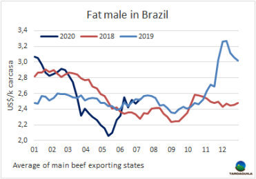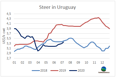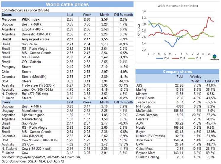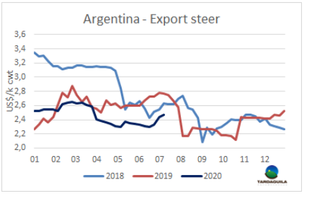 南方共同市場四國待宰牛平均價格連續(xù)第二周上漲。南方市場閹牛價格指數(shù)上漲了5美分,上漲至2.65美元/公斤,達(dá)三月中旬疫情在南美爆發(fā)以來最高。漲幅在3-6美分,受當(dāng)?shù)乩讈啝杻r格上漲拉動,盡管匯率漲了1.5%,巴西主要出口州育成牛價格上漲6美分,上漲至2.53美元/公斤。烏拉圭和巴拉圭牛價上漲5美分,烏拉圭牛價在南美地區(qū)最高,達(dá)3.3美元/公斤。巴拉圭牛價是南美地區(qū)最低,2.4美元/噸。阿根廷出口閹牛價格上漲3美分,上漲至2.69美元/公斤胴體價,包含9%的牛肉出口稅。