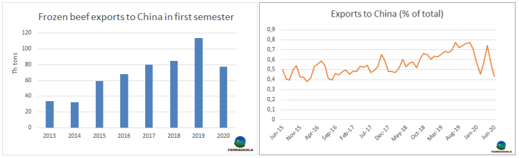 上一季度冰鮮牛肉出口量較冷凍牛肉出口量下降幅度更大,歐洲、巴西、智利等冰鮮牛肉的傳統(tǒng)市場受新冠疫情影響,需求大幅下降。4-6月,烏拉圭冰鮮牛肉出口量6053噸,同比減少36%,冷凍牛肉出口量64420噸,同比減少18%。烏拉圭出口商正在尋找其他替代市場。在過去的一個季度,到北美和亞洲的出口量顯著增加。出口至北美市場898噸,是2019年同期338噸的兩倍多。到亞洲出口量增加了近150%,達(dá)814噸,其中出口至日本566噸,出口至中國248噸。過去兩個月,冰鮮牛肉到中國出口量已經(jīng)從很少增長至每月5柜。本季度出口到中國的冰鮮牛肉平均價格5685美元/噸,而冷凍牛肉平均價格為4561美元/噸。