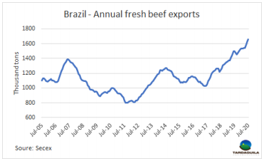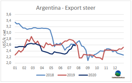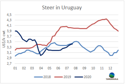 歐盟昨日宣布的大規(guī)模經(jīng)濟(jì)刺激計(jì)劃,以及新冠肺炎疫苗研制進(jìn)展的利好消息,帶動(dòng)了市場(chǎng)的樂觀情緒,推高了主要股指,新興國家貨幣也有升值。昨天巴西雷亞爾增值2.4%,較一周前增值3%,促進(jìn)牛價(jià)堅(jiān)挺。巴西主要出口州育成牛雷亞爾平均價(jià)格上漲了0.7%,美元價(jià)格上漲0.9美分,上漲至2.62美元/公斤。巴拉圭和烏拉圭牛價(jià)保持冬季一直以來的上行趨勢(shì)。巴拉圭閹牛報(bào)價(jià)2.45美元/噸,烏拉圭牛價(jià)要高出1美元,3.43美元/噸。阿根廷出口閹牛比索價(jià)格與上周保持不變,由于比索官方匯率珠江下跌,美元價(jià)格下跌2美分至2.81美元/公斤。南方共同市場(chǎng)活牛價(jià)格指數(shù)本周上漲5美分,上漲至2.74美元/公斤。