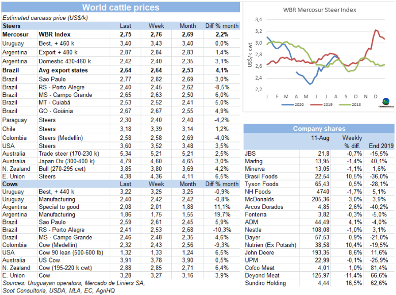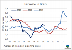 受巴拉圭和烏拉圭牛價(jià)下跌以及巴西雷亞爾匯率疲軟的影響,本周南方共同市場(chǎng)閹牛價(jià)格指數(shù)下跌1美分,下跌至2.75美元/公斤。巴西方面在基準(zhǔn)利率Selic再次下調(diào)至2%的歷史新低后,美元在一周內(nèi)上漲了2%。此外有跡象表明,牛價(jià)還將進(jìn)一步下跌。雷亞爾的疲軟掩蓋了以當(dāng)?shù)刎泿庞?jì)算的育成牛價(jià)格上漲,最后,以美元計(jì)的價(jià)格仍保持在2.64美元/噸不變。烏拉圭方面牛價(jià)保持急劇下跌的趨勢(shì),出口閹牛成交價(jià)最高3.4美元/公斤,較上周下跌3美分。南美地區(qū)唯一一個(gè)育成牛價(jià)格上漲的國(guó)家是阿根廷,上漲了3美分,出口閹牛價(jià)格上漲至2.87美元/公斤,包含出口稅。