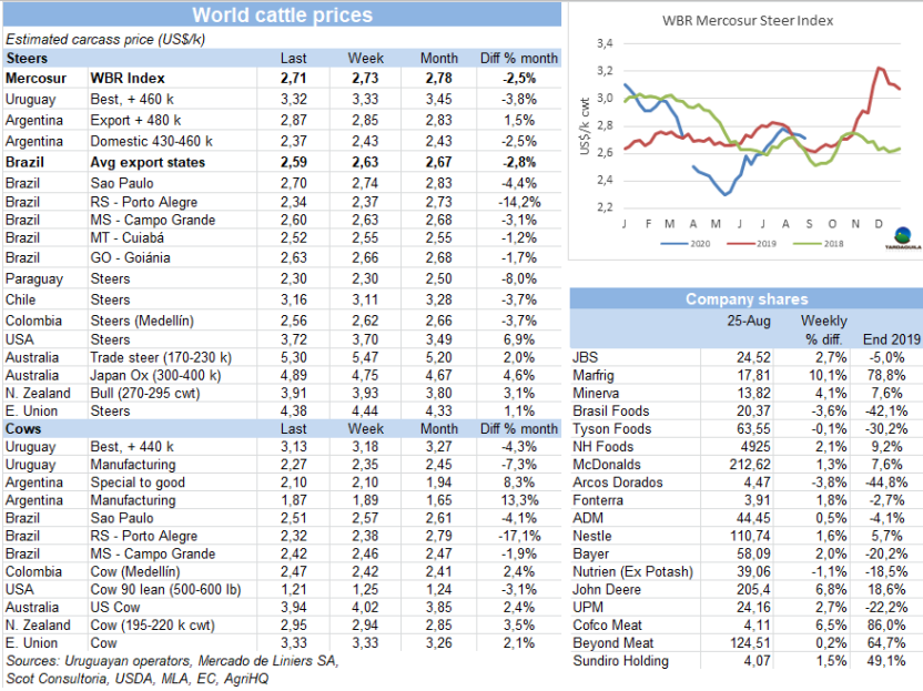 本周巴西雷亞爾貶值2.6%,因此盡管巴西待宰牛價格保持堅挺,甚至上漲,美金育成牛牛價仍下跌4美分,下跌至2.59美元/公斤。這是本周南方共同市場閹牛價格指數(shù)下跌2美分至2.71美元/公斤的主要原因。其他地區(qū)牛價保持穩(wěn)定,阿根廷有輕微漲幅,烏拉圭牛價下跌。