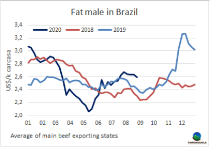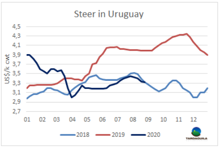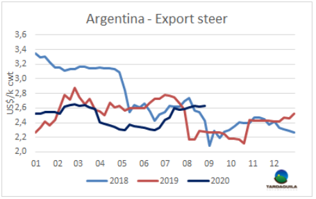 下周猶太屠宰季即將結(jié)束。猶太屠宰季始于6月,在阿根廷外交部和以色列大使館的共同努力下,牛肉加工機構(gòu)設(shè)法將猶太潔食的工作人員從以色列包機帶回。屠宰隊將在猶太新年結(jié)束工作,目前還不清楚他們什么時候能回來。因此,牛犢的貿(mào)易在一個月到一個半月之內(nèi)將退出游戲。這使工廠面臨的情況更加復(fù)雜,閹牛價格上漲,國內(nèi)市場低迷,希爾頓配額價格由于新冠疫情的再次出現(xiàn)和需求的疲軟而下跌,美國配額用盡,中國市場僅有貨值低的部位需求且價格上漲緩慢。