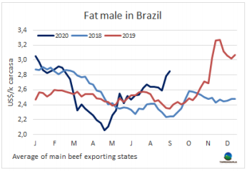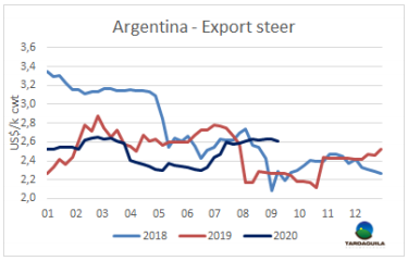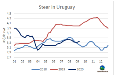 智利牛肉旺季(也就是九月國慶節(jié)假日)開始前的一周,巴拉圭的發(fā)運有一些延誤。由于疫情防控采取了隔離措施,目前尚不清楚需求量會有多大。牛肉消費量下降,豬肉和家禽等價格更低的蛋白質占據了智利市場。