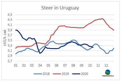 本周巴西活牛價(jià)格堅(jiān)挺是南美地區(qū)牛價(jià)上行的主要原因。本周南方共同市場(chǎng)閹牛價(jià)格指數(shù)上漲3美分,上漲至2.93美元/公斤。唯一一個(gè)牛價(jià)上漲的國(guó)家是巴西,育成牛雷亞爾價(jià)格連續(xù)第13周上漲,伴隨著雷亞爾增值0.6%,主要出口州育成牛平均價(jià)格上漲7美分,上漲至2.98美元/公斤。阿根廷和烏拉圭情況相反,牛價(jià)下行。歐洲市場(chǎng)疲軟對(duì)閹牛價(jià)格產(chǎn)生了消極影響,閹牛價(jià)格下跌6美分下跌至2.66美元/公斤。烏拉圭方面由于供應(yīng)增長(zhǎng),特種閹牛價(jià)格在3.2美元/公斤左右徘徊。巴拉圭結(jié)束了連續(xù)六周的上漲,待宰公牛成交價(jià)保持2.8美元/公斤。