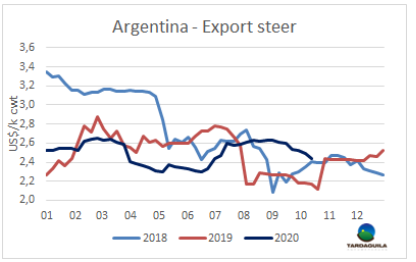 盡管阿根廷貨幣強(qiáng)勢(shì)貶值,但由于歐洲市場(chǎng)需求疲軟,價(jià)格下跌,出口閹牛價(jià)格下跌3比索/公斤。最好的英國(guó)純種閹牛目前成交在185-190比索/公斤。串種澤布牛參考價(jià)保持穩(wěn)定,185-188美元/噸。另一方面,中國(guó)市場(chǎng)是目前唯一有興趣的市場(chǎng),中國(guó)需求增強(qiáng),拉動(dòng)活牛價(jià)格上漲。特優(yōu)母牛價(jià)格上漲了12-15比索,上漲至170-178比索。工業(yè)母牛價(jià)格上漲了14比索,目前報(bào)價(jià)在155-160比索。