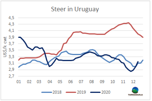 阿根廷牛價(jià)飆升,成為南美地區(qū)牛價(jià)最高的國(guó)家,這是自2017年至今三年來(lái)從未發(fā)生過(guò)的事情。本周育肥閹牛供應(yīng)短缺再次推高價(jià)格。包含出口稅的美元價(jià)格3.39美元/公斤,較上周上漲了8美分。烏拉圭閹牛價(jià)格也由于供應(yīng)短缺大幅上漲,本周成交價(jià)3.15美元/噸。恰恰相反,巴拉圭和巴西的牛價(jià)下行,本周巴西牛價(jià)按雷亞爾計(jì)下跌了5%,雷亞爾0.7%的升值部分抵消了雷亞爾價(jià)格的下行。巴西中央銀行表示,即將放棄將參考利率保持在最低水平的承諾,目前美元雷亞爾匯率為5.育成牛平均價(jià)格本周下跌了14美分至3.22美元/公斤。巴拉圭方面育成牛價(jià)格下跌至2.7美元/公斤。因此,南方共同市場(chǎng)閹牛價(jià)格指數(shù)下跌了5美分,下跌至3.2美元/公斤。