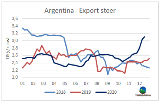 新的一年阿根廷將獲得2021年在美國(guó)市場(chǎng)2萬(wàn)噸的肉類免稅配額,這些配額按照“先到先得”的原則分配。因此,被批準(zhǔn)出口至美國(guó)的肉類加工商已經(jīng)準(zhǔn)備向美國(guó)出口肉類,在其他市場(chǎng),尤其是歐盟市場(chǎng)波動(dòng)之際,這是一個(gè)很好的補(bǔ)充。據(jù)了解,后部位肉的售價(jià)在5500-5800美元/噸,還有一些西冷,由于歐盟市場(chǎng)的反彈,西冷價(jià)格將會(huì)上漲。