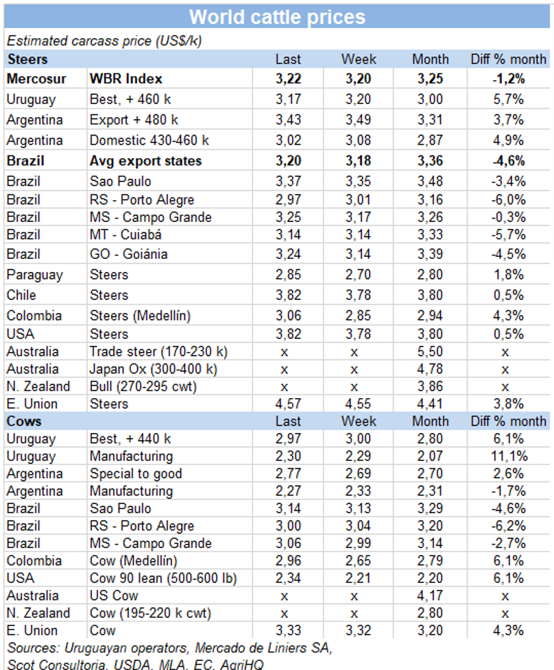 本周南方共同市場閹牛價格指數(shù)上漲了2美分上漲至3.22美元/公斤,主要受巴西和巴拉圭活牛價格上漲的影響。巴西方面活牛價格上漲了5.4雷亞爾/15公斤,上漲了2.2%,被1.4%的雷亞爾貶值部分抵消,美元牛價上漲了2美分至3.2美元/公斤。巴拉圭方面近幾周牛價維持在較低水平,本周牛價開始強(qiáng)勢上漲,由于臨近口蹄疫疫苗接種期,且降水充足,待宰公牛上漲了15美分,至2.85美元/公斤。烏拉圭和阿根廷活牛價格走勢相反,烏拉圭市場供應(yīng)飽和,阿根廷方面幾周以來牛價上漲了30%后保持穩(wěn)定。