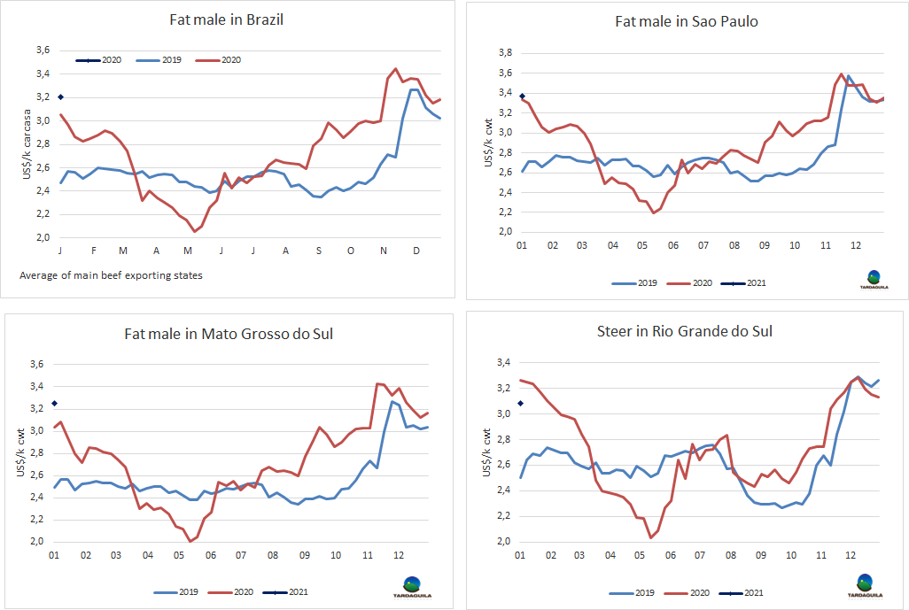 巴西育成牛價格的下行修正階段很短,2021年第一周,活牛價格開始回漲,盡管較11月價格高點(diǎn)仍有差距,昨天圣保羅活牛成交價266雷亞爾/15公斤,30天付款(適合與出口市場的低齡活牛成交價高出7雷亞爾)。較上周增長了10雷亞爾/15公斤。市場成交有限,供應(yīng)偏緊。批發(fā)市場后部位肉價格回漲,昨天參考價21.1雷亞爾/公斤較上周上漲了40美分,前部位肉價仍保持穩(wěn)定,14.4雷亞爾/公斤。