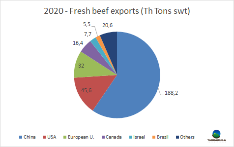 2020年烏拉圭牛肉出口量31.6萬噸,較2019年減少了1萬噸,較2018年最高出口量減少了1.3萬噸,平均出口價格5105美元/噸,同比下降了7%。對中國出口量18.8萬噸,占總出口量的60%,其中包括74.6萬噸牛副(約占85%)。牛肉的第二出口目的地是美國,對美國出口量4.6萬噸,占總出口量的14%,第三是歐盟,對歐盟出口量3.2萬噸,占總出口量的10%。其次是加拿大(1.64萬噸)、以色列(7.7萬噸)和巴西(5.5萬噸)。