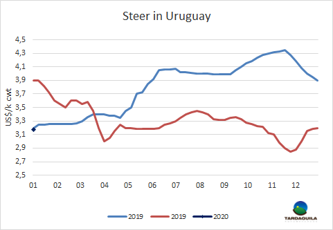 今年前幾天,盡管供應(yīng)不足,但需求飽和,價格較上周下降了幾美分。畜牧生產(chǎn)最大的擔(dān)憂就是缺乏降水,烏拉圭一半以上的地區(qū)都宣布進(jìn)入農(nóng)業(yè)緊急狀態(tài),希望都寄托在周三的天氣預(yù)報(bào)上,天氣預(yù)報(bào)宣布將有不同強(qiáng)度的降雨和風(fēng)暴,雖然不均勻,但范圍廣泛。大部分活牛預(yù)定期限達(dá)15-20天,一些工廠為月末的生產(chǎn)預(yù)定了活牛。目前市場價格參差不齊,一些工廠甚至不給還價,另外有工廠還價低于上周價格5美分。由于成交極少,很難建立價格參考。未來市場走勢還將取決于降雨情況,目前降雨已開始蔓延到烏拉圭南部。