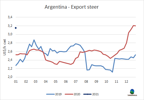 新年之后猶太屠宰業(yè)務(wù)沒有太大轉(zhuǎn)變,牛前部位肉價格水平和2020年年末一樣,根據(jù)閹牛和母牛的比例以及是否為谷飼,成交價約6700美元/噸。猶太屠宰目前是很好的替代市場。阿根廷方面價格也保持上個月的成交水平,根據(jù)品牌的口碑不同,成交范圍在7700-8200美元/噸。