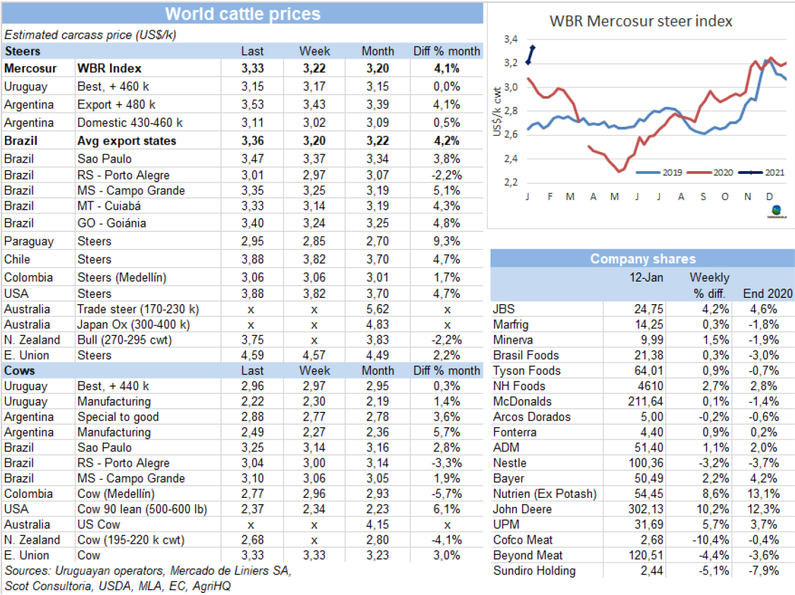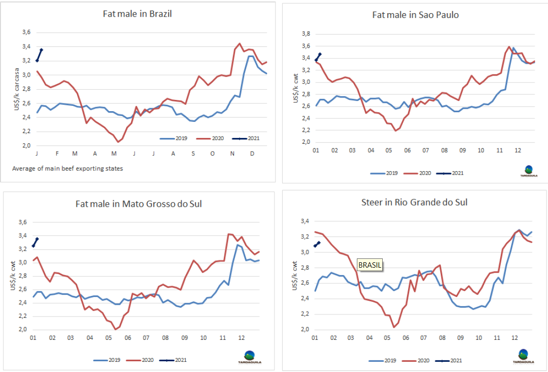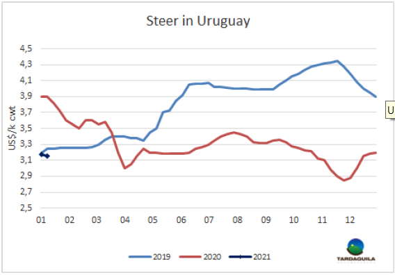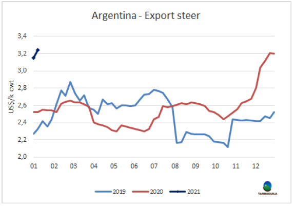育成牛價(jià)格連續(xù)11周累計(jì)上漲了31%之后,在年初價(jià)格小幅下跌,預(yù)計(jì)出口活牛價(jià)格將繼續(xù)下跌。一方面由于出口稅的原因,1月份通常比在12月份更方便生產(chǎn)商銷(xiāo)售,另一方面國(guó)內(nèi)需求受隔離影響減弱和一些國(guó)際市場(chǎng)尤其是歐洲市場(chǎng)的困難。然而,在沒(méi)有明確的理由支持這種復(fù)蘇的情況下,牛價(jià)又恢復(fù)了上漲的趨勢(shì)。最好的英國(guó)純種閹牛價(jià)格下上漲了10比索,至270-280比索/公斤,串種閹牛價(jià)格上漲了10-15比索至265-275比索/公斤,特優(yōu)母牛價(jià)格保持232-242比索/公斤,主要出口至中國(guó)的工業(yè)母牛價(jià)格上漲了2-4美分,215-218比索/公斤。