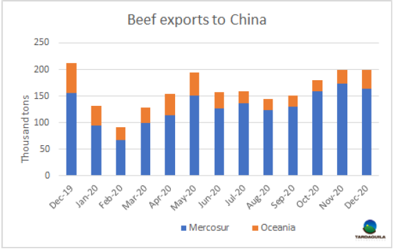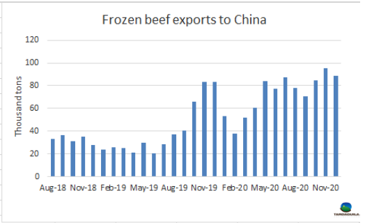 12月全球?qū)χ袊?guó)牛肉出口量保持高水平