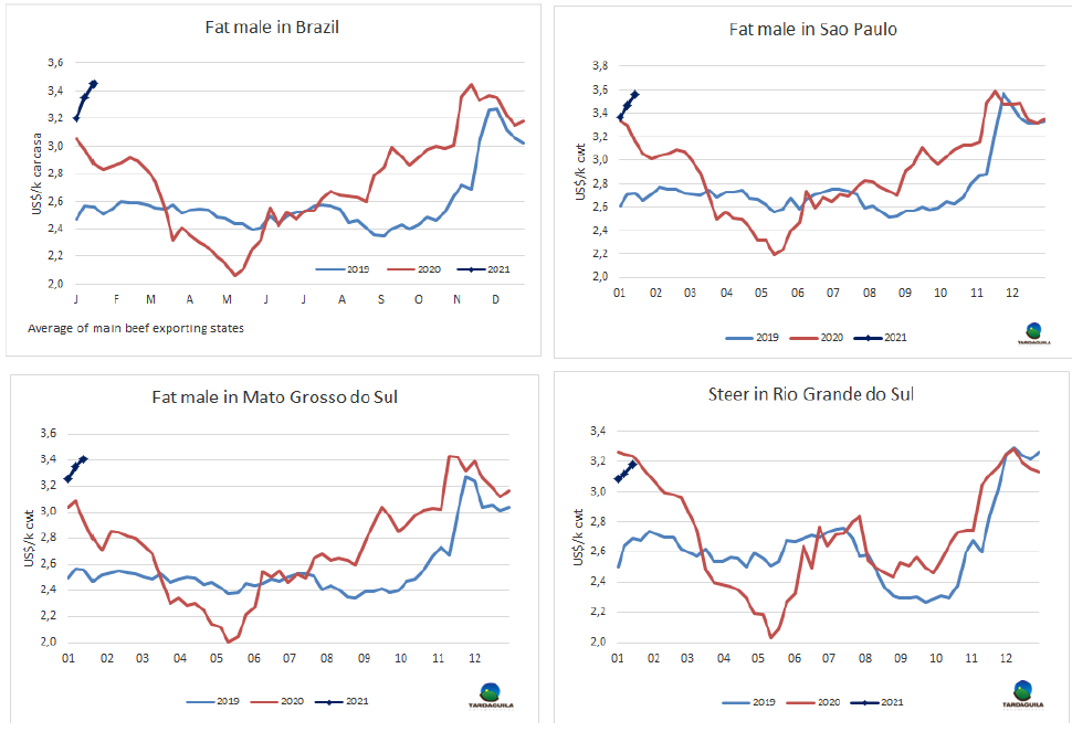 根據(jù)美國農(nóng)業(yè)部的預(yù)測,到2021年,南美市場四個國家的牛肉出口量預(yù)計將達(dá)423萬噸。由于巴西(+5%)、烏拉圭(+8%)和巴拉圭(+4%)的預(yù)期出口量增加,南美出口量較2020年增加了11.6萬噸(+3%),這將部分抵消阿根廷的出口量7%的下降。北美的出口量也將增長,在這種情況下,10.1萬噸(+ 5%),增加的三個主要國家,而澳洲出口量將下降10.2萬噸(-5%),主要是由于澳大利亞出口的急劇下降,約下降7%,至136萬噸。由于澳大利亞正在進(jìn)行重建存欄,牛肉出口量較2019年減少了37.8萬噸(-21%)。