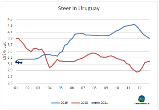 根據(jù)烏拉圭肉協(xié)提供的信息,12月閹牛的平均價值為1118美元/頭,而肉類加工業(yè)對閹牛的采購價格下降到819美元。2020年最后4個月閹牛的價格保持在1100美元/頭左右,而9月-12月之間,每頭牛的采購價格下降了100多美元。因此,兩者之間的差額,也就是INAC所稱的工業(yè)增加值(行業(yè)必須彌補(bǔ)成本,并最終保持利潤),增加到每頭牛299美元,達(dá)閹牛價值的26.7%。無論從絕對數(shù)字還是相對數(shù)字來看,都是自去年四月以來的最高水平。INAC解釋說,閹牛價格每月的增長是由“出口部位肉、鮮皮、內(nèi)臟和副產(chǎn)品的價格增長”帶來的?!氨粐鴥?nèi)市場銷售價格的下降所部分抵消。2020年,工業(yè)增加值占閹牛價值的20%,高于2019年的17%,但低于2017年和2018年的27%和22%。從趨勢上看,當(dāng)工業(yè)增加值占閹牛價值的20%-25%時,閹牛價值相對平衡,低于20%時價值下降,高于25%價值增長。