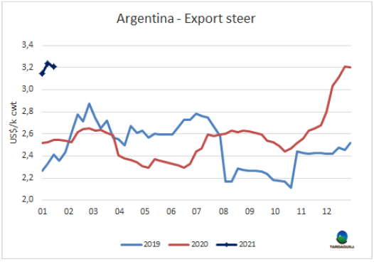 阿根廷政府在2020年最后一天宣布的為期兩個月的玉米出口禁令后取消了這一決策,改為限制每日3萬噸的出口配額,之后政府也取消了這一限制措施。然而,對于出口的擔(dān)憂仍然存在。今年是選舉年,政府將特別關(guān)注牛肉價格,在當(dāng)前通貨膨脹的背景下,牛肉價格嚴(yán)重影響消費(fèi)者價格指數(shù)在阿根廷人的文化中根深蒂固。與政府關(guān)系非常密切的經(jīng)濟(jì)學(xué)家們認(rèn)為,必須通過加征出口稅將國內(nèi)價格與國外價格脫鉤,以至于與總統(tǒng)關(guān)系密切的副總統(tǒng)Fernanda Raverta稱阿根廷存在“出口食品的詛咒”。