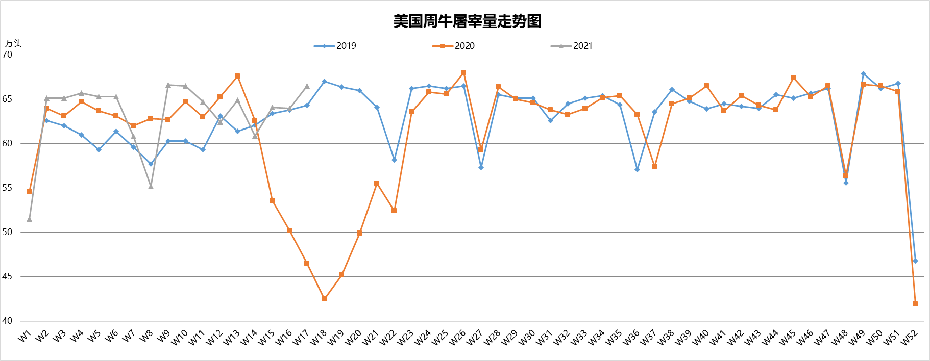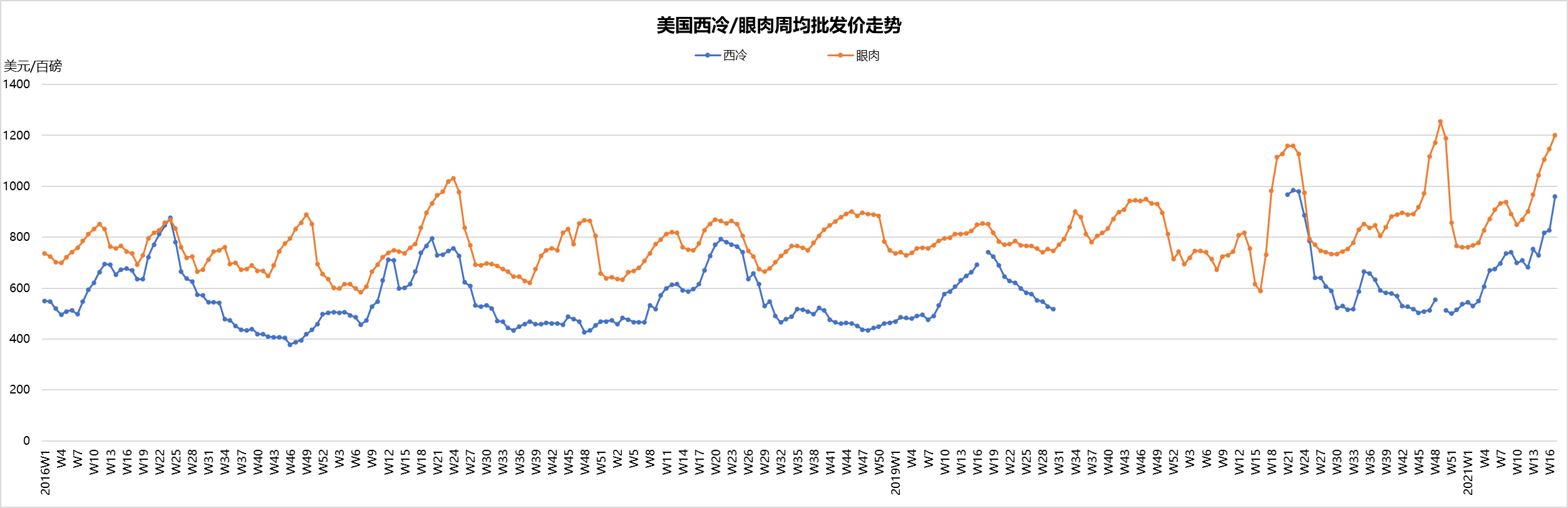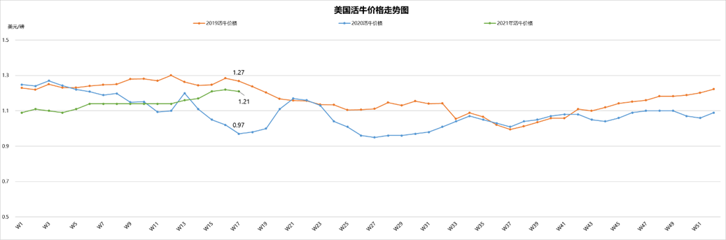 最近兩周美國(guó)活牛價(jià)格穩(wěn)中微跌,本周活牛價(jià)格1.21美元/磅。盡管批發(fā)市場(chǎng)牛肉價(jià)格不斷上漲,但育肥場(chǎng)充足的供應(yīng)和工廠的產(chǎn)能限制仍然是制約活牛價(jià)格上漲的兩個(gè)主要原因。