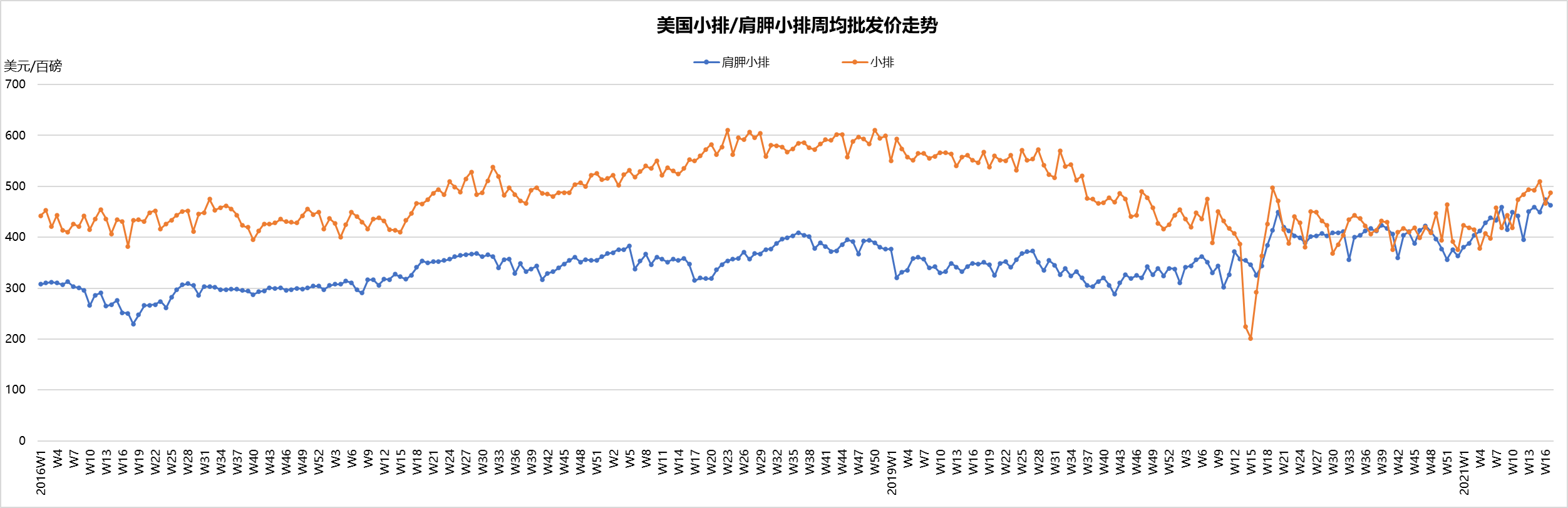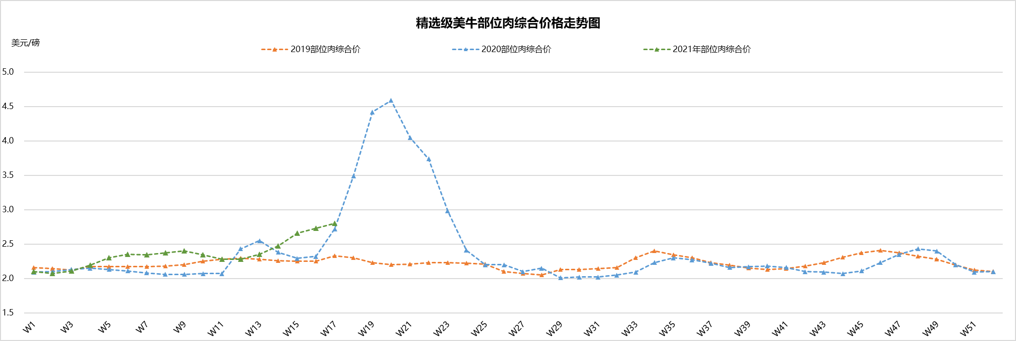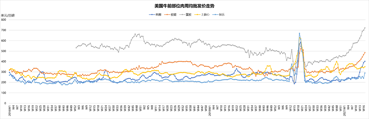 4月部位肉批發(fā)價(jià)保持堅(jiān)挺,精選級(jí)部位肉綜合價(jià)2.8美元/磅,較上周增長(zhǎng)了2.5%,較去年同期上漲了2.9%。去年受疫情影響部位肉批發(fā)價(jià)急劇上漲。餐飲的復(fù)蘇是最近部位肉價(jià)格上漲的主要原因。