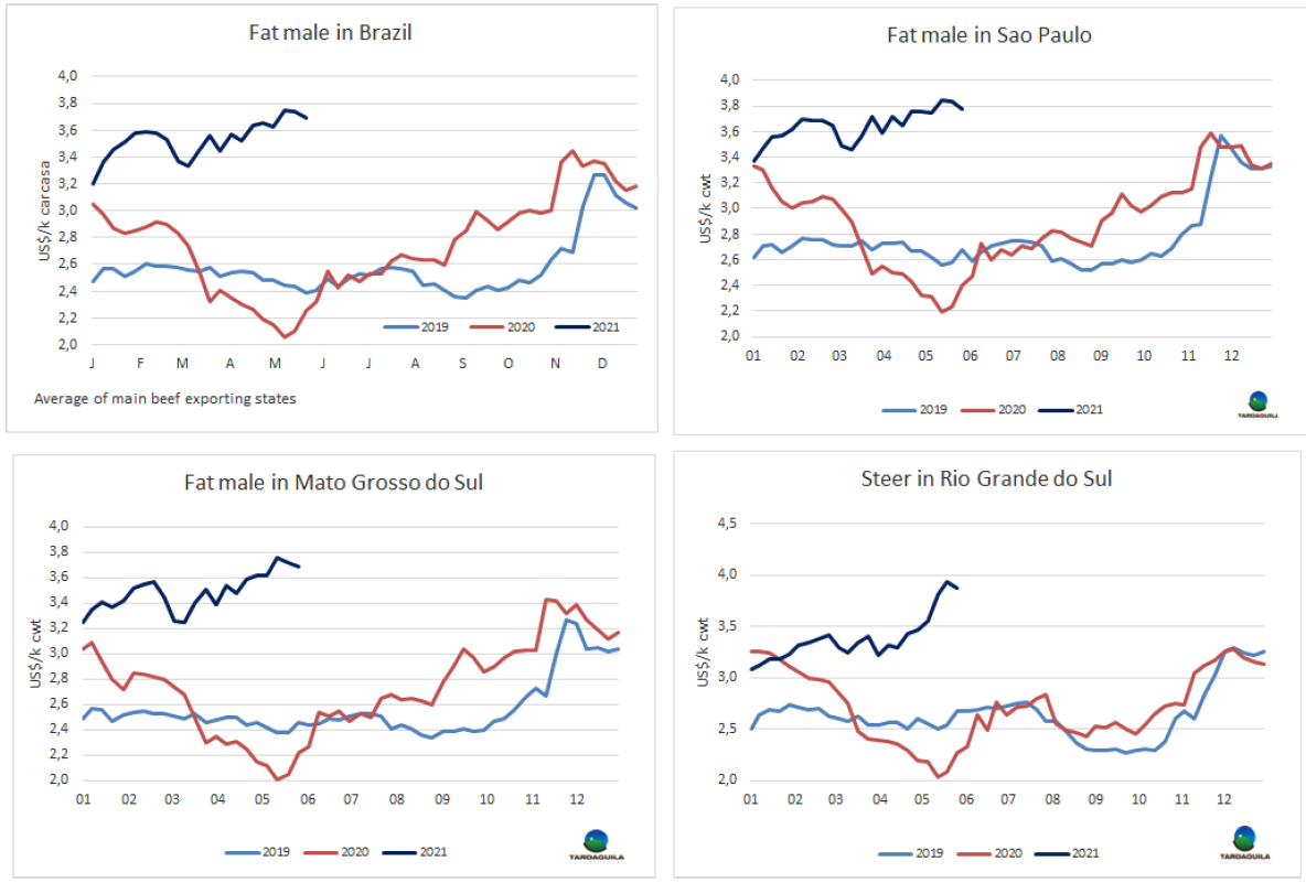 自2018年七月起,巴西牛肉月出口量連續(xù)34個(gè)月超過(guò)10萬(wàn)噸。在此之前,月出口量超過(guò)10萬(wàn)噸連續(xù)最長(zhǎng)的階段是自2006年5月至2007年6月的連續(xù)14個(gè)月。據(jù)分析,這是強(qiáng)勁的國(guó)際市場(chǎng)需求所導(dǎo)致的,尤其是來(lái)自中國(guó)的需求。巴西的產(chǎn)能無(wú)法跟上日益增長(zhǎng)的需求,帶來(lái)的結(jié)果則是待宰牛、架子牛和國(guó)內(nèi)市場(chǎng)牛肉價(jià)格的持續(xù)上漲。2018年7月育肥牛平均價(jià)格209雷亞爾/15公斤,2018年年末育肥牛價(jià)格上漲至219雷亞爾/15公斤。2019年年初育肥牛參考價(jià)220雷亞爾/15公斤,2020年育肥牛價(jià)格達(dá)300雷亞爾/15公斤。2021年前5個(gè)月育肥牛價(jià)格達(dá)310雷亞爾/15公斤,今年年底到期的期貨合約價(jià)格將達(dá)約330雷亞爾/15公斤。