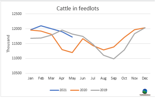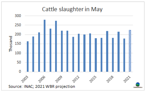 上周牛屠宰量再次增長(zhǎng),烏拉圭肉協(xié)報(bào)告統(tǒng)計(jì),上周屠宰量55712頭,較前一周增長(zhǎng)了2000多頭,達(dá)今年周屠宰量的第二高。較去年同期增長(zhǎng)了超過(guò)10000頭。隨著歐洲481配額的生產(chǎn)全面打開,閹牛屠宰量達(dá)29938頭,達(dá)2018年3月第三周至今三年多以來(lái)最大,同樣,小母牛屠宰量達(dá)6263頭,達(dá)3月第一周以來(lái)最大。相反,母牛屠宰量下降至18598頭,較上周下降了2432頭。屠宰量最大的工廠是Athena-Pulsa(4956頭),Las piedras(4532頭),Athena-Canelones(4476頭)。本周Athena三家工廠屠宰總量13639頭,Marfrig四家工廠屠宰總量13772頭,日資企業(yè)BPU上周五進(jìn)行了最后一次屠宰活動(dòng),本周暫未開始屠宰,還在等待中國(guó)市場(chǎng)的重新準(zhǔn)入。截止5月22日,牛屠宰量達(dá)160548頭,較2020年同期增加了15575頭,約增長(zhǎng)了20%。如果不出現(xiàn)疫情相關(guān)的重大問(wèn)題,五月屠宰量將超過(guò)22萬(wàn)頭,達(dá)10年以來(lái)最高。 5月也將成為連續(xù)第八個(gè)屠宰量高于去年同期的月份。