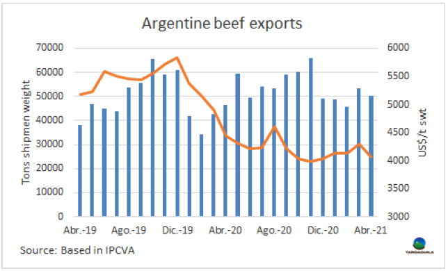 阿根廷政府為控制國(guó)內(nèi)肉類價(jià)格的上漲實(shí)行了30天的出口禁令,該禁令排除對(duì)該國(guó)有關(guān)稅配額的出口活動(dòng),如希爾頓配額,481配額,美國(guó)配額和哥倫比亞配額。對(duì)以色列冰鮮產(chǎn)品的出口是否可以排除在外還不能確定。希爾頓配額和481配額代表著絕大多數(shù)牛肉對(duì)歐盟的出口量。2021年前四個(gè)月,阿根廷對(duì)歐洲冰鮮牛肉出口量達(dá)10187噸,出口額達(dá)9010萬(wàn)美元,481配額出口量1540噸。同一時(shí)期阿根廷對(duì)美國(guó)出口量4427噸,占配額總量的22.7%,出口額2660萬(wàn)美元。哥倫比亞的配額目前關(guān)聯(lián)不大。因此,被排除的出口量占總出口量的7.4%,由于這些產(chǎn)品的成交價(jià)格很高,按美元計(jì)的占比可能更高。除中國(guó)市場(chǎng)外,受出口暫停政策影響的市場(chǎng)主要是以色列、智利和巴西。除這些市場(chǎng)之外,目前正在進(jìn)行的發(fā)貨包括上周一(正式知道禁令的那一天)之前簽訂的所有銷售訂單,以及在聲明和該措施生效(周四公布第75號(hào)決議)之間登記的銷售訂單。在此期間,許多出口商仍在繼續(xù)進(jìn)行牛肉出口。